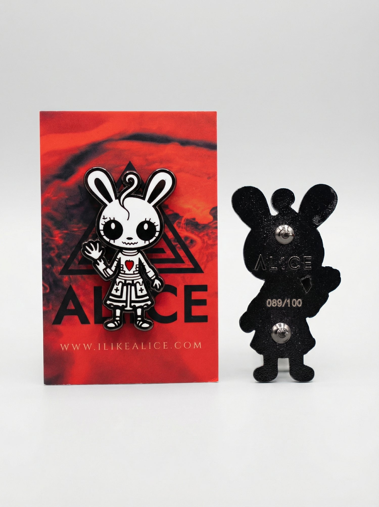 This pin is a statement piece. It is a symbol of the night, the music, the mythos. Crafted with care and intention in collaboration with the mischievous AL1CE mascot NYX, it carries the energy of everything AL1CE stands for.